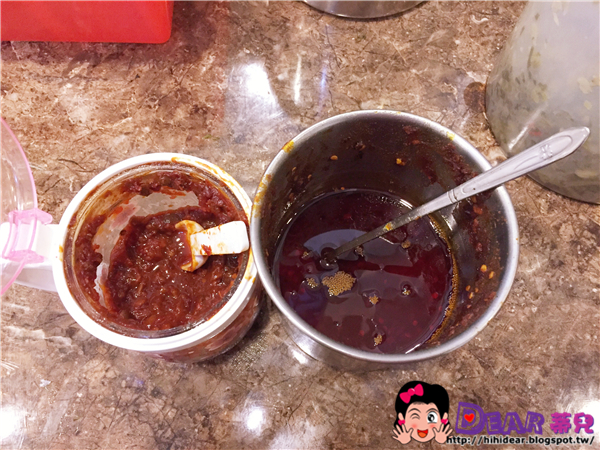 辣醬我要特別介紹,店裡有兩種一種是豆瓣醬(圖片左邊),一種是老闆特製辣椒醬(圖片右邊)→店裡的辣椒醬是老闆自己炒的,味道比較香,我覺得也有比較辣,辣椒籽如果挑好、炒好辣度就會出來,也才會香,我真想凹我同學給我一點帶回家用,哈哈~~