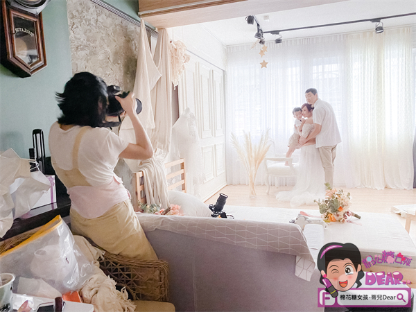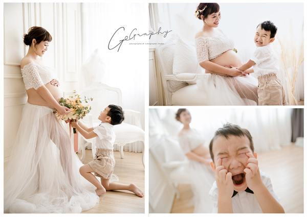 在服裝與風格上,因為我有丟出了我想要的想法,加上已經有大寶,所以我們家也會往親子寫真、全家福方向進行(不能因為有了二寶就忽略我們家開心果大寶吧!?),所以果果能很快知道我想要的風格,所以連妝髮造型師Elsa一併在造型上很快就定案了。剩下就是時間到的時候,準時到土城攝影棚進行拍攝囉~
