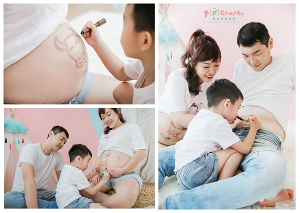 既然大寶要一起入鏡,我希望在寫真部分除能表現出輕鬆愉快感外,也希望能有一點童趣的氛圍,當我們一家拿起人體彩繪畫筆時,我即有預感能達到這個目標,大寶的活潑與古靈精怪在這組照片很好發揮,也發揮得很好。
